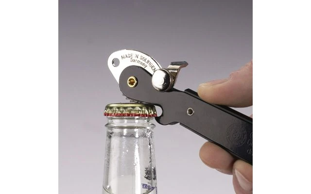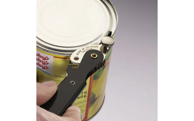 Práctico abrelatas de palanca para abrir latas de comida redondas y cuadradas, incl. levantador de tapas para abrir botellas con tapas de corona.