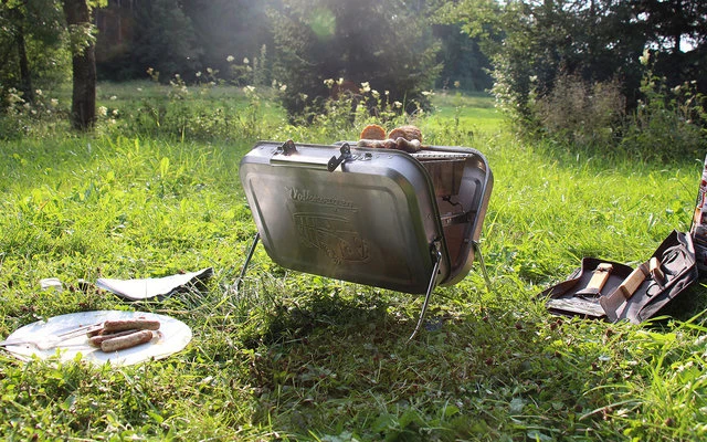 Práctica miniparrilla para camping & co. Acero inoxidable 18/8 con motivo del VW Bulli T1. La mini barbacoa se monta en pocos segundos y puede utilizarse perfectamente como barbacoa de camping, en picnics o en festivales gracias a su práctico formato de maleta. Gracias a su práctico tamaño, puede guardarse en la furgoneta o en el equipaje de la acampada para ahorrar espacio y ocupa poco. La parrilla de acero inoxidable de alta calidad es también un magnífico regalo para los fans del VW Bus o los campistas profesionales gracias a su relieve VW Bulli y a su buena elaboración. Licencia oficial de Volkswagen y garantía de calidad.