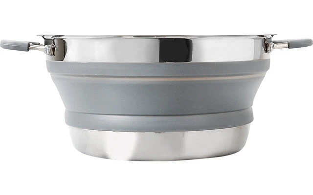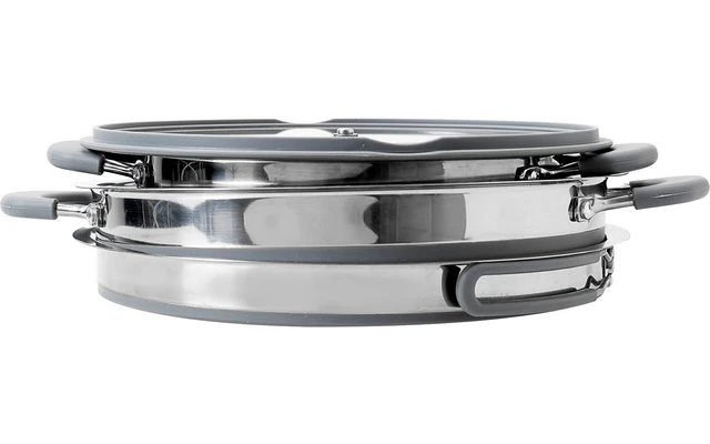 El juego de cocina de 4 piezas, fabricado en acero inoxidable y silicona de alta calidad, consta de una olla grande, una sartén con mango abatible, un práctico escurridor y una tapa de vidrio inastillable con borde antideslizante. Las asas están recubiertas de silicona resistente al calor. Y lo mejor de todo: gracias a las paredes flexibles de silicona, el conjunto puede plegarse de forma extremadamente plana (9 cm de altura) y guardarse uno dentro del otro, por lo que ocupa muy poco espacio en su equipaje. Además, es fácil de limpiar, apto para alimentos, sin BPA y apto para el lavavajillas.