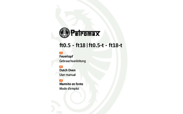 Olla de fuego con fondo plano (Dutch Oven), manual de instrucciones (alemán/inglés/francés)