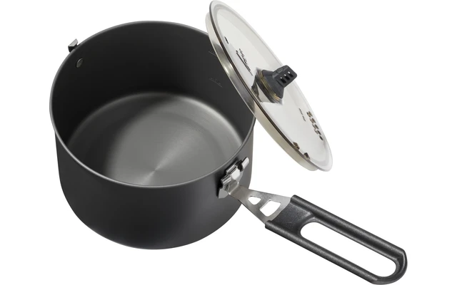 La olla Trail Lite (1,3 litros) para mochileros es especialmente ligera y robusta gracias a su construcción de alta calidad en aluminio anodizado duro, lo que la convierte en una sólida pieza básica del equipo para viajes en solitario. Esta olla se caracteriza por la distribución uniforme del calor y la resistencia a los arañazos del aluminio. Es ideal para hervir agua, así como para comidas sencillas durante excursiones en solitario o para complementar a otros cocineros al aire libre. Su forma compacta y su asa plegable/enganchable hacen que ocupe muy poco espacio, para que puedas llegar lejos y rápido.