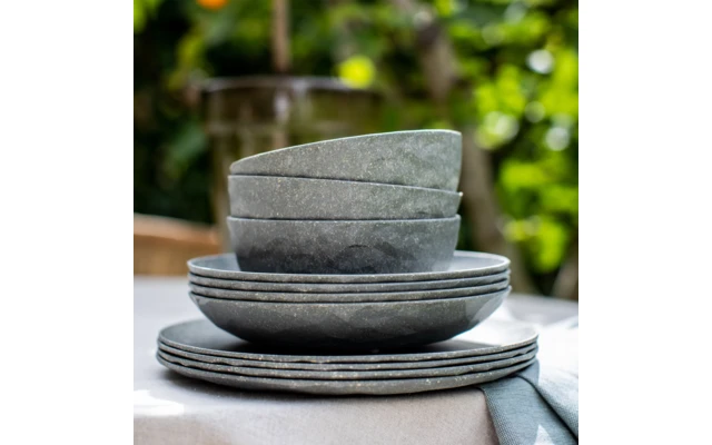 El plato universal para fiestas en el jardín, picnics o glamping y todas las ocasiones que tengan lugar preferentemente al aire libre. El exterior luce una animada estructura facetada y su sólida calidad y amplia base transmiten la buena sensación de una cena de alta calidad en cualquier momento y lugar. Ideal para todas las actividades al aire libre en las que no quiera perderse una vajilla con estilo.