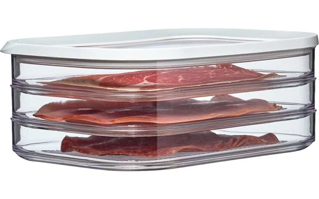 La tapa transparente con borde blanco y anillo de cierre garantiza un sellado perfecto, lo que hace que estas latas Modula sean ideales para almacenar diversos embutidos y productos cárnicos