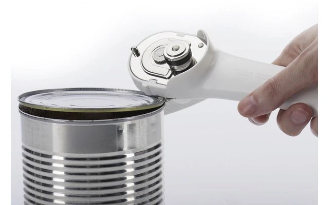 Práctico abrelatas de seguridad para abrir latas redondas y cuadradas, ventaja: no hay bordes afilados, la tapa de la lata se puede volver a colocar: la lata se corta en el borde.